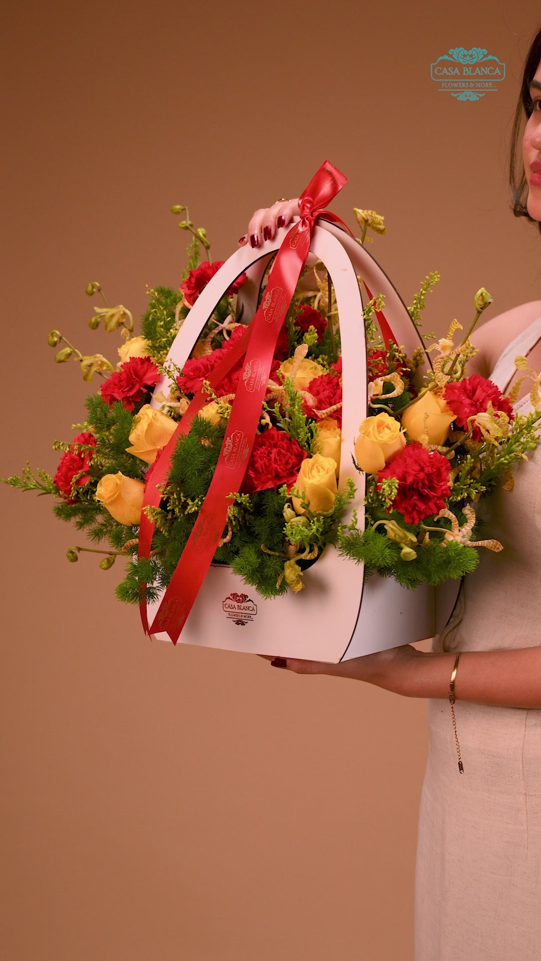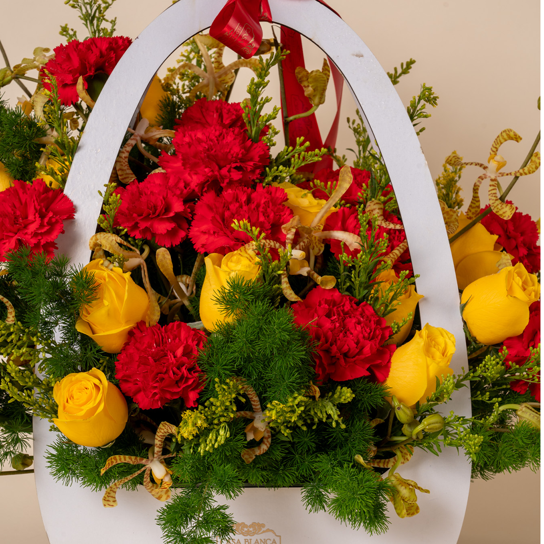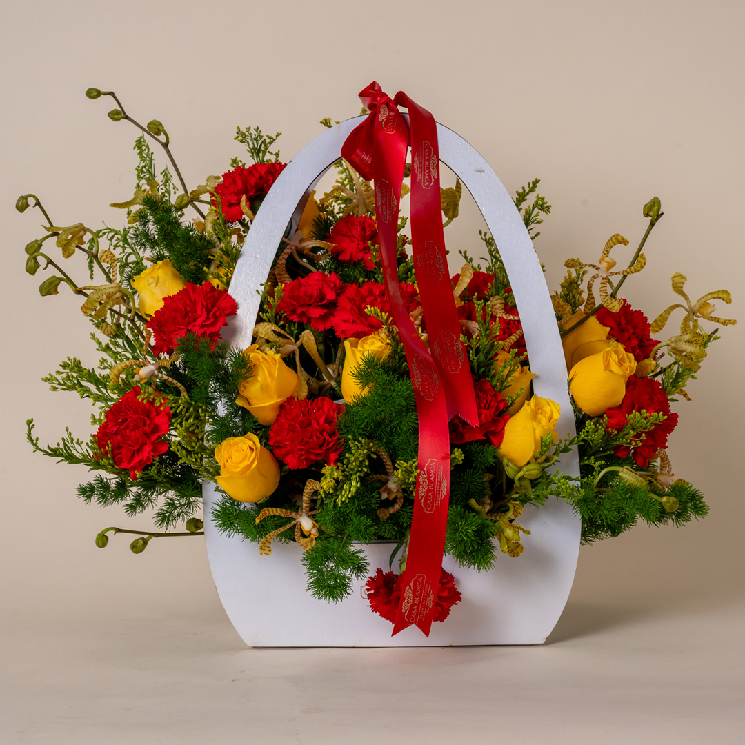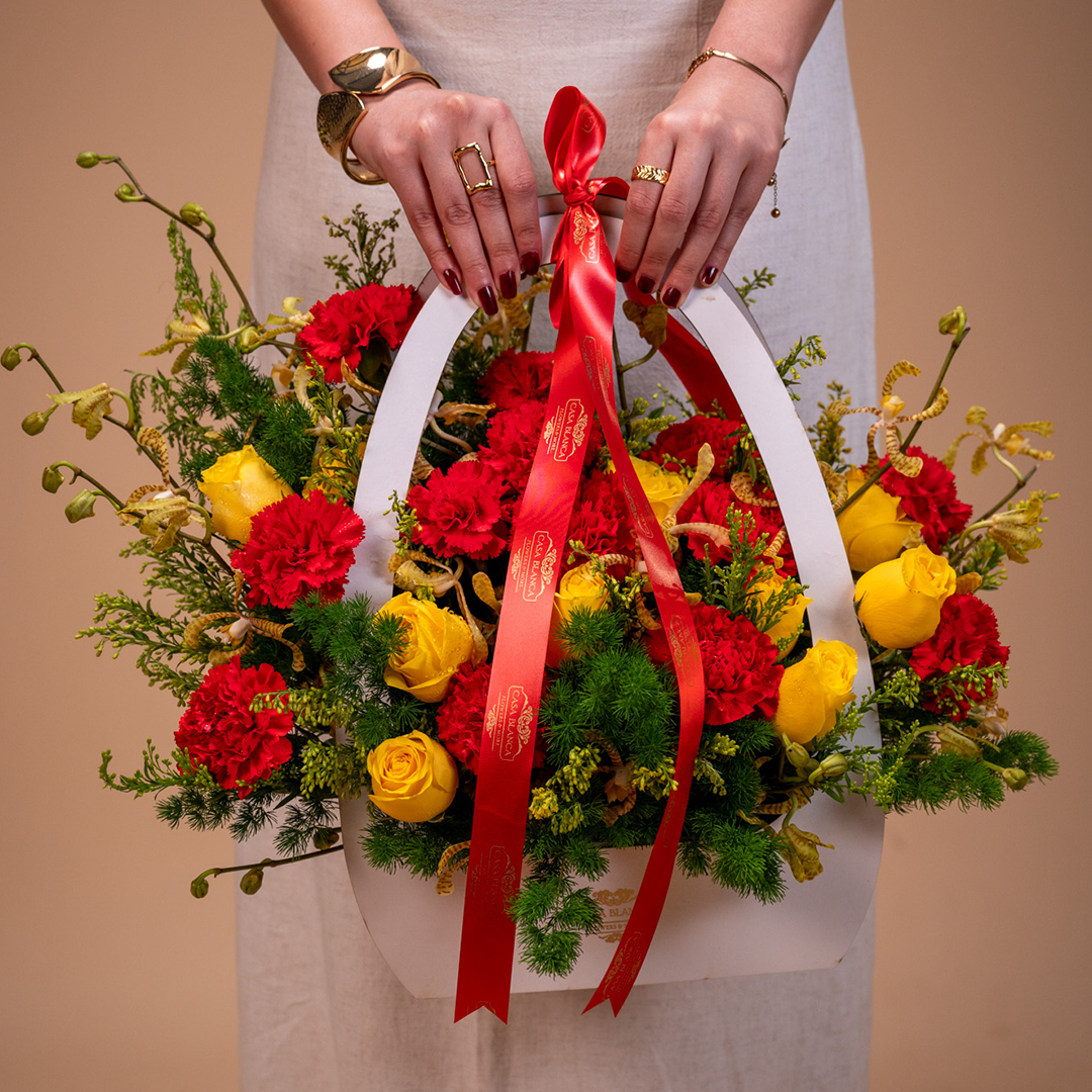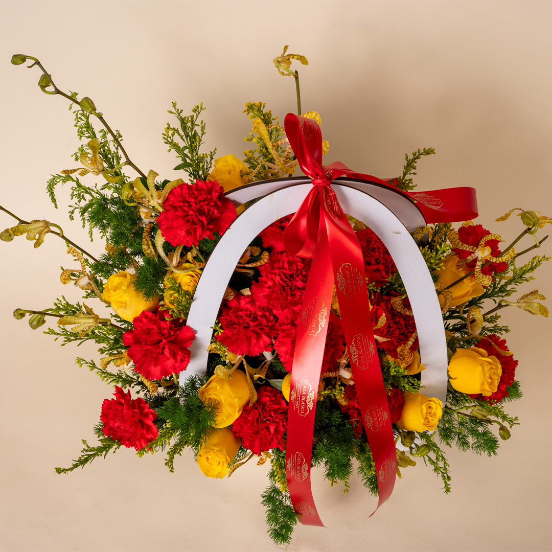 A classic red floral arrangement with subtle golden accents for elegant gifting.